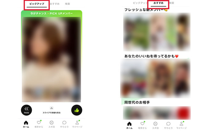 マッチングする可能性が高い人を見つける方法として、「ピックアップ」機能と「おすすめ」機能があります。