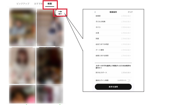 「検索」画面には、ログイン時間が新しい相手が順に表示されます。細かい条件で理想の相手を探したい方は「検索」画面の右上にある検索条件で相手を絞って検索しましょう。