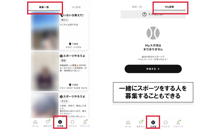 「スポ活」機能は、スポーツを通して出会える相手を探す機能です。