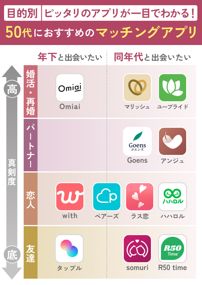 マッチングアプリはそれぞれ年齢層や利用目的が異なるため、50代が理想の出会いを実現するにはアプリ選びが重要です。