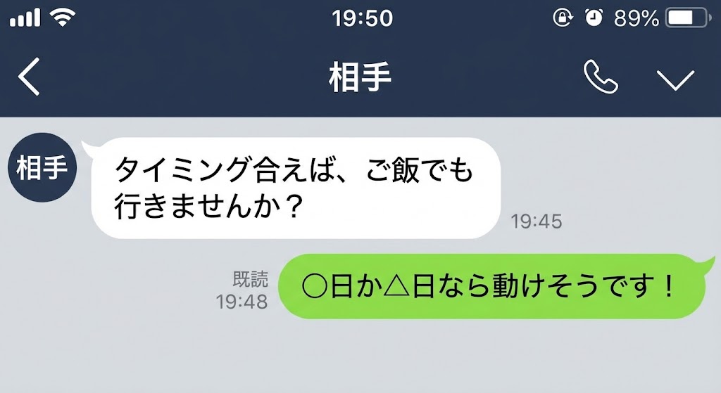 相手「タイミング合えば、ご飯でも行きませんか?」