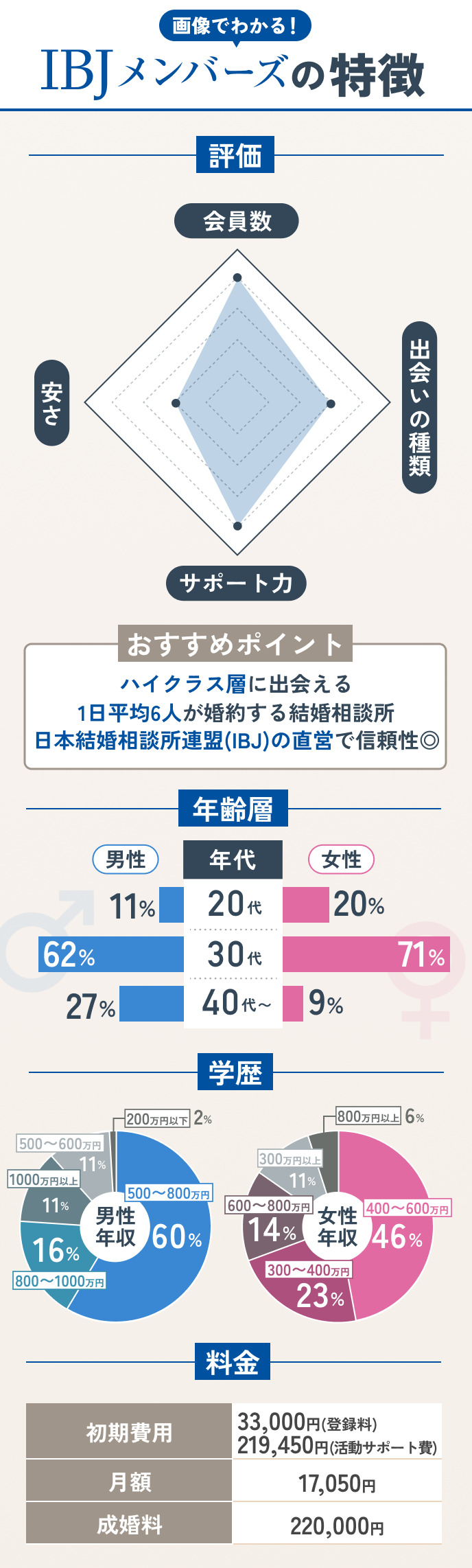 男性の63%が年収600万円以上と高収入男性が多く、女性の78.9%が大学卒以上のため、しっかりとした職業に就いている人が多い。日本結婚相談所連盟(IBJ)の直営で信頼性が高い。